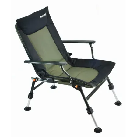 Fotel wędkarski z oparciem firmy Mistrall. Wygodny fotel przeznaczony dla wędkarzy ceniących sobie komfort podczas wędkowania, wyposażony w płynną regulację siedziska, wysokiej jakości materiał oddychający, malowany proszkowo, aluminiowe podłokietniki. Łatwy do rozłożenia, posiada teleskopowe, wysuwne i regulowane nóżki zaopatrzone we wsporniki, dzięki którym fotel nie zapada się w ziemię. Zastosowana regulacja nóg pozwala dopasować fotel do nierówności terenu każdego łowiska. Wewnątrz materiału wszyta została miękka gąbka, co sprawia, że fotel jest bardzo wygodny. Możliwe jest rozłożenie fotela do pozycji zupełnie leżącej.