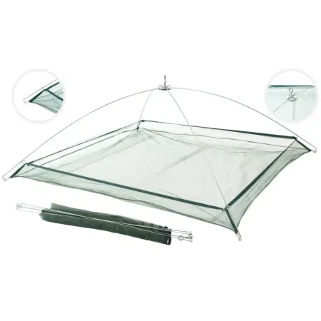 Kwadratowa podrywka o wymiarach 110 x 110 cm rozpięta na składanym metalowym pałąku. Podrywka posiada kołnierz o wysokości 15 cm, który zapobiega wypadnięciu ryb z siatki oraz końcówkę do zamontowania sznurka znajdującą się na wierzchołku stelarza.