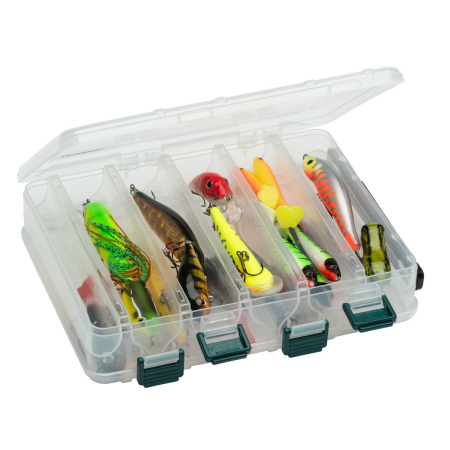 Duże, dwustronnie otwierane pudełko na pilkery, woblery, błystki i inne akcesoria, wykonane z przezroczystego plastiku.