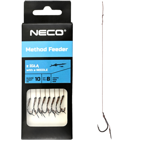 Profesjonalne gotowe przypony do method feeder firmy Neco, wyposażone w haczyki z zadziorem oraz bagnet o długości 7 mm, który umożliwia szybkie i stabilne mocowanie przynęt. Każdy przypon ma długość 10 cm i został wykonany z wyjątkowo miękkiej, a zarazem mocnej plecionki o średnicy 0,18 mm w maskującym brązowym kolorze, dzięki czemu jest mniej widoczny na dnie łowiska.